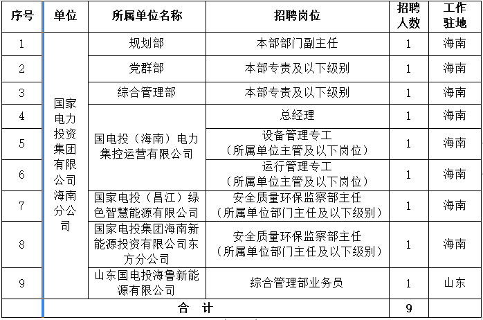 詳見《國家電力投資集團有限公司海南分公司所屬單位招聘崗位職責及任職條件》(附件1)。