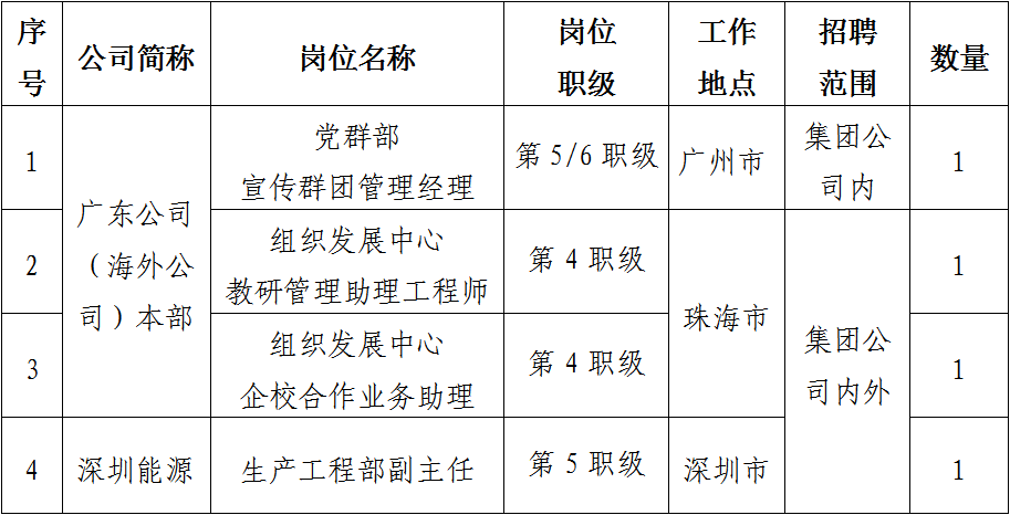 根據(jù)工作需要,依據(jù)公司招聘管理相關(guān)規(guī)定,現(xiàn)對廣東公司(海外公司)本部及系統(tǒng)內(nèi)部分三級單位共4個崗位進行公開招聘。