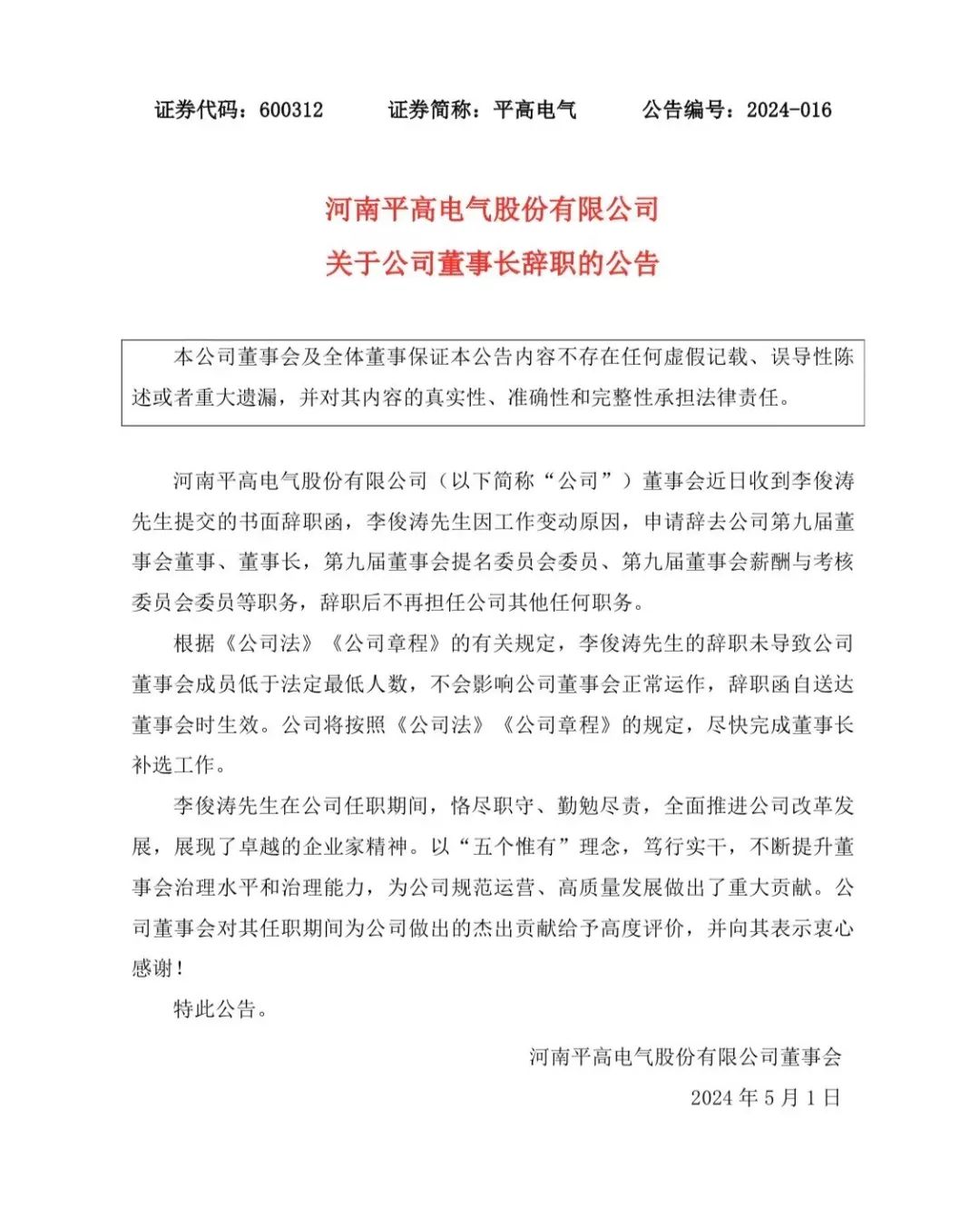 5月1日,平高電氣發(fā)布公告稱,公司董事會(huì)近日收到李俊濤先生提交的書(shū)面辭職函,李俊濤先生因工作變動(dòng)原因,申請(qǐng)辭去公司第九屆董事會(huì)董事、董事長(zhǎng),第九屆董事會(huì)提名委員會(huì)委員、第九屆董事會(huì)薪酬與考核委員會(huì)委員等職務(wù),辭職后不再擔(dān)任公司其他任何職務(wù)。