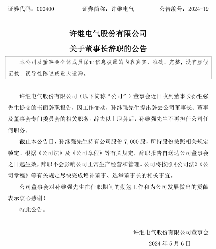 5月5日,許繼電氣發(fā)布公告,董事會近日收到董事長孫繼強提交的書面辭職報告,因工作變動,孫繼強提出辭去公司董事長、董事及董事會專門委員會的相關(guān)職務(wù)。