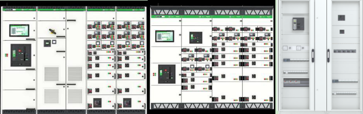 從左至右:新一代預(yù)智低壓成套設(shè)備 BlokSeT、Okken、PrismaSeT