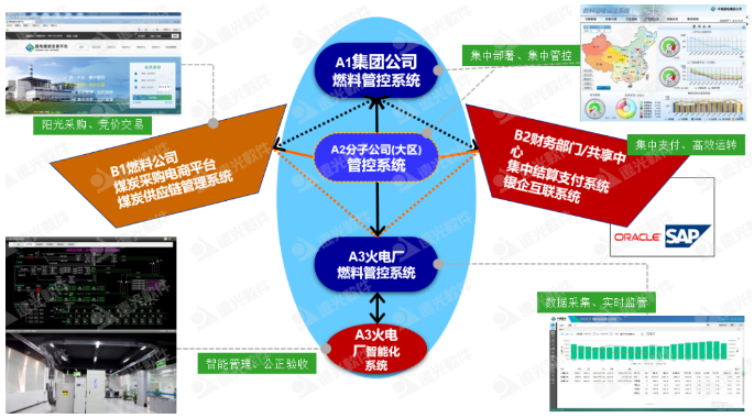 在縱向貫通方面,通過在集團公司總部部署燃料管控信息系統(tǒng),以集中部署、集中管控為實施原則,發(fā)揮集團公司的計劃管理和實施監(jiān)督的管理職能。在分(子)公司部署燃料管控系統(tǒng),作為燃料縱向三級管控中承上啟下的“橋梁”,對下屬電廠采購、入廠、結算實施監(jiān)管,同時進行區(qū)域內調控;協(xié)助集團公司進行保供控價的執(zhí)行,落實集團對燃料指標管控要求。在電廠部署燃料管控信息系統(tǒng)(A2)與燃料智能化系統(tǒng)(A3),作為燃料管控的執(zhí)行主體,內容包括入廠計量過程智能化系統(tǒng)、采制樣過程智能化系統(tǒng)、化驗管理網(wǎng)絡化系統(tǒng)、煤場管理數(shù)字化系統(tǒng)、入爐煤管理系統(tǒng)、門禁系統(tǒng)、燃料集中監(jiān)控系統(tǒng)和監(jiān)控中心、燃料業(yè)務管理系統(tǒng)。