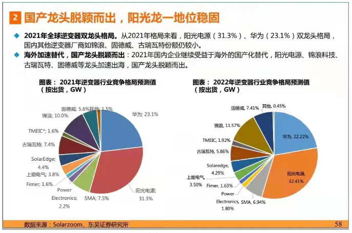 經過多年大浪淘沙式的行業(yè)洗牌后,馬太效應凸顯,2021年全球逆變器呈現(xiàn)雙龍頭格局。從2021年格局來看,陽光電源占據(jù)31.3%的市場,而華為占據(jù)23.1%。