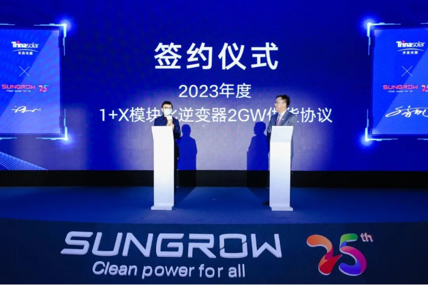 天合智慧能源許凌女士在簽約現(xiàn)場表示:“與陽光電源一樣,天合光能今年也25歲了,雙方一起在光伏行業(yè)砥礪前行,都取得了長足的發(fā)展。多年來,我們見證陽光電源始終保持著蓬勃的創(chuàng)新活力和高質量的產品輸出。這次與陽光電源簽訂了2GW的‘1+X’模塊化逆變器供貨協(xié)議,期待用陽光的逆變新品,打造出更好的光伏電站。”