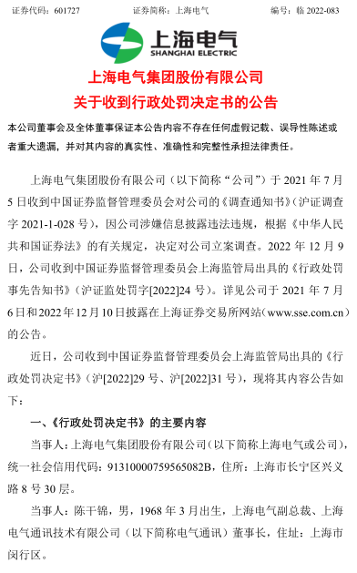 上海電氣12月25日晚間公告稱,近日,公司收到上海證監(jiān)局出具的《行政處罰決定書》,因未及時披露相關(guān)重大事件、2020年年報存在虛假記載,被警告并罰款500萬元;對上海電氣副總裁、電氣通訊董事長陳干錦給予警告,并處50萬元罰款。