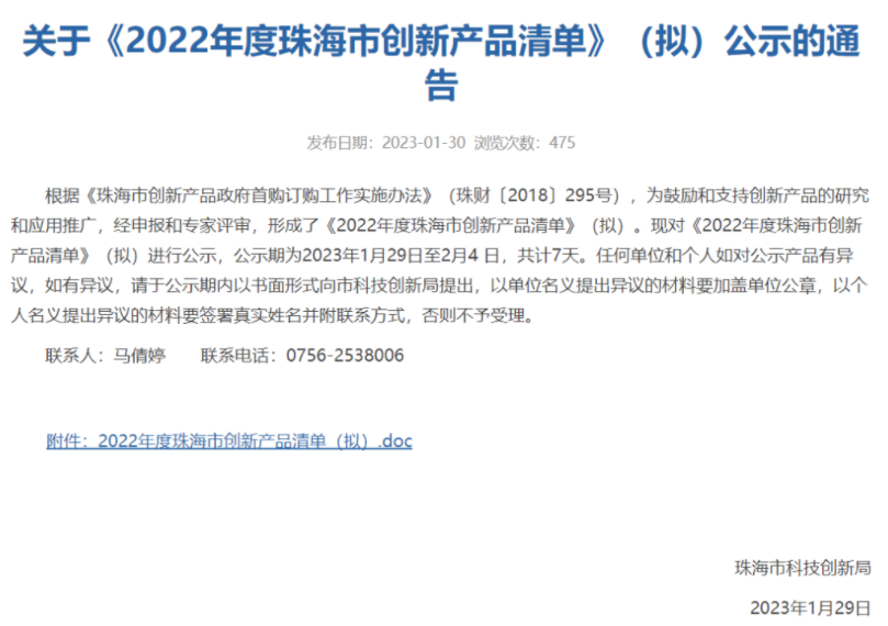 《2022年度珠海市創(chuàng)新產(chǎn)品清單》,是根據(jù)《珠海市創(chuàng)新產(chǎn)品政府首購訂購工作實(shí)施辦法》(珠財(cái)〔2018〕295號),經(jīng)企業(yè)申報(bào)和專家評審而來,旨在為鼓勵和支持創(chuàng)新產(chǎn)品的研究和應(yīng)用推廣。