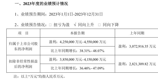 1月30日晚間,寧德時(shí)代公告,預(yù)計(jì)2023年歸屬上市股東的凈利潤(rùn)425億元—455億元,同比增長(zhǎng)38.31%—48.07%??鄢墙?jīng)常性損益后的凈利潤(rùn)為385億元—415億元,同比增長(zhǎng)36.46%—47.09%。