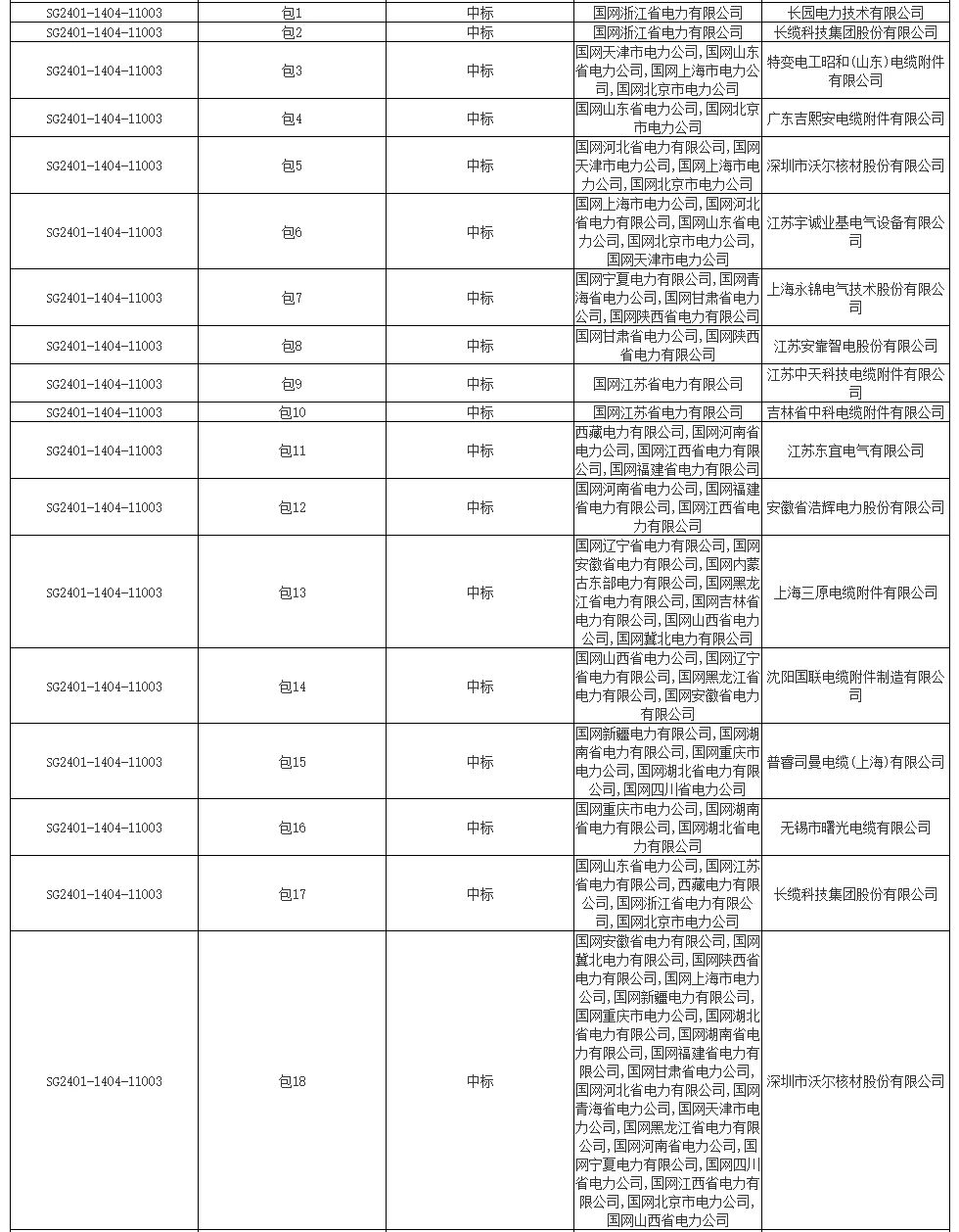 3月12日,國(guó)網(wǎng)公司電子商務(wù)平臺(tái)(ECP)網(wǎng)站發(fā)布國(guó)家電網(wǎng)有限公司2024年第一批采購(gòu)(輸變電項(xiàng)目第一次變電設(shè)備(含電纜)招標(biāo)采購(gòu))中標(biāo)公告(招標(biāo)編號(hào):0711-240TL00211001),其中分標(biāo) SG2404-1404-11003電纜附件共18包,有16家供應(yīng)商中標(biāo),具體見(jiàn)下圖。