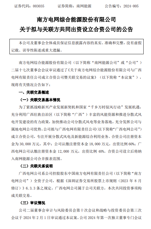 2月7日,南方電網(wǎng)綜合能源股份有限公司發(fā)布公告稱,擬與廣西電網(wǎng)有限責(zé)任公司(下稱“廣西電網(wǎng)”)成立合資公司廣西綜合能源有限公司,專注開展分散式風(fēng)電及新能源綜合利用業(yè)務(wù)。