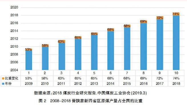 在供給側(cè)結(jié)構(gòu)性改革政策的推動(dòng)下,煤炭產(chǎn)能集中度進(jìn)一步提高。十八大以來,國務(wù)院相繼出臺(tái)了關(guān)于深化煤炭市場化改革的一系列文件,增大了煤炭去產(chǎn)能力度,截至到2018年底,基本上提前完成了“十三五”煤炭去產(chǎn)能8億噸的計(jì)劃,淘汰關(guān)閉了一大批不合標(biāo)準(zhǔn)的煤礦。同時(shí),為了滿足日益增長的能源市場需要,新建、擴(kuò)建、技改一批現(xiàn)代化礦井,產(chǎn)能已達(dá)到14.96億噸。據(jù)中國煤炭工業(yè)協(xié)會(huì)統(tǒng)計(jì),全國煤礦數(shù)量從2015年的1.08萬處減少到目前的5800處,年產(chǎn)能120萬噸及以上的大型煤礦產(chǎn)量超過80%,年產(chǎn)能30萬噸及以下小型煤礦減少至10%以下。煤炭開采向大型煤炭基地集中,其產(chǎn)量占全國總產(chǎn)量的95%以上,5000萬噸級(jí)以上大型礦井產(chǎn)量占60%以上。煤炭生產(chǎn)布局進(jìn)一步向晉、陜、蒙、新地區(qū)等地區(qū)集中。2018年,內(nèi)蒙古、山西、陜西、新疆、貴州、山東、河南、安徽等8個(gè)億噸級(jí)規(guī)模以上企業(yè)原煤產(chǎn)量達(dá)31.2億噸,占全國的88.1%,其中,晉、陜、蒙、新四省(區(qū))原煤產(chǎn)量占全國的74.3%。見圖1、圖2。
