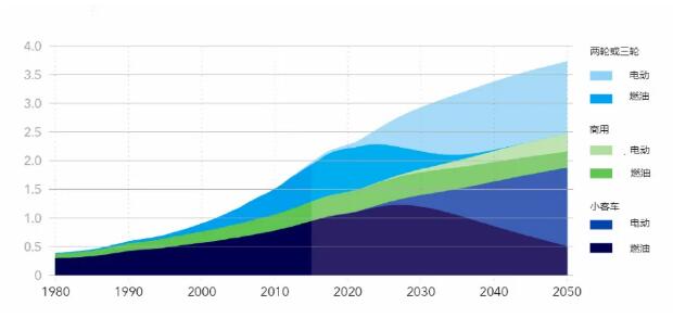 圖:全球不同類型和動力系統(tǒng)的路面交通工具數(shù)量統(tǒng)計(jì)(單位:百萬輛)