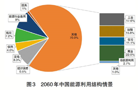 決定碳排放的第二個(gè)因素是能源清潔水平,而能源清潔水平是由非化石能源發(fā)展決定的。非化石能源(水、核、風(fēng)、光等)主要以電能形式被利用,到2060年將作為主要的能源品種用于社會生產(chǎn)生活,預(yù)計(jì)將占能源消費(fèi)總量的80%以上(見圖4),客觀上決定了未來以清潔電力為中心的高電氣化能源利用格局,同時(shí)也表明電力系統(tǒng)深度脫碳對碳中和目標(biāo)的重要作用。而非完全電氣化部門,例如少數(shù)工業(yè)過程(采礦、鋼鐵、水泥、化工等部分生產(chǎn)環(huán)節(jié))、交通部門(長距離貨運(yùn)、遠(yuǎn)洋航運(yùn)和航空等),盡管生產(chǎn)能耗顯著降低,但部分生產(chǎn)環(huán)節(jié)仍需一定量的化石能源,難以實(shí)現(xiàn)完全脫碳,意味著仍會有一定數(shù)量的與能源相關(guān)的二氧化碳排放。這部分二氧化碳需要由碳匯來中和。碳匯主要包括自然碳匯(自然生態(tài)系統(tǒng)固碳)和技術(shù)碳匯(碳捕獲與儲存技術(shù),CCS)。2016年我國森林碳匯達(dá)到每年5-6億噸水平;有研究顯示,2010-2016年中國陸地生態(tài)系統(tǒng)碳匯年均11.1±3.8億噸,未來自然碳匯會小幅增加但很難實(shí)現(xiàn)翻倍增長。預(yù)計(jì)2060年我國能源相關(guān)碳排放降至14億噸,若加上非能源類碳排放,無法完全依靠自然碳匯實(shí)現(xiàn)碳中和,還需發(fā)展技術(shù)碳匯。