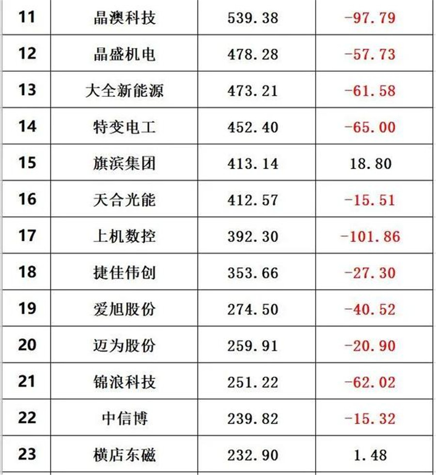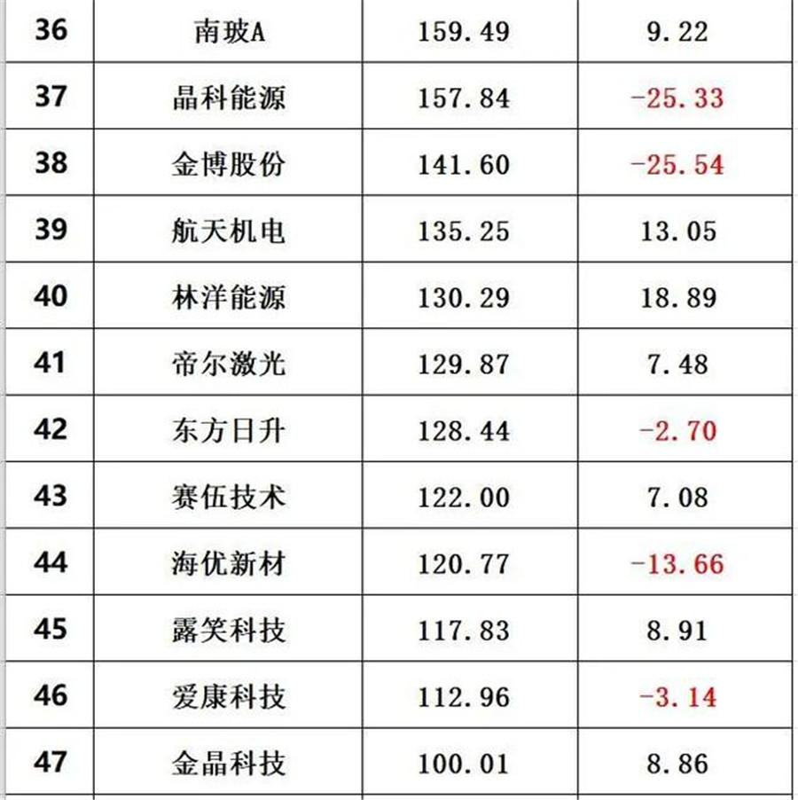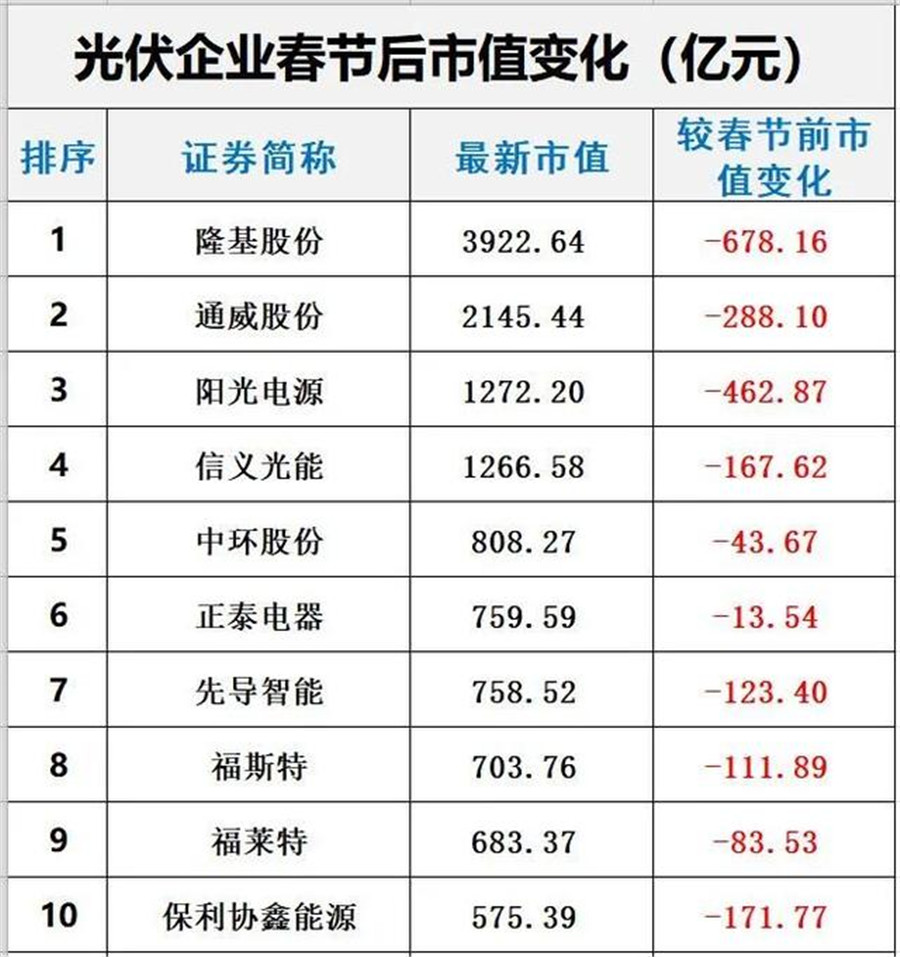 其中隆基股份總市值較春節(jié)前下跌678億、通威股份下跌288億、陽(yáng)光電源跌去462億、信義光能下跌167億、中環(huán)股份下跌43億、正泰電器跌去13億、先導(dǎo)智能跌去123億、福斯特跌去111億、福萊特跌去83億、保利協(xié)鑫能源跌去171億、晶澳科技跌去97億。
