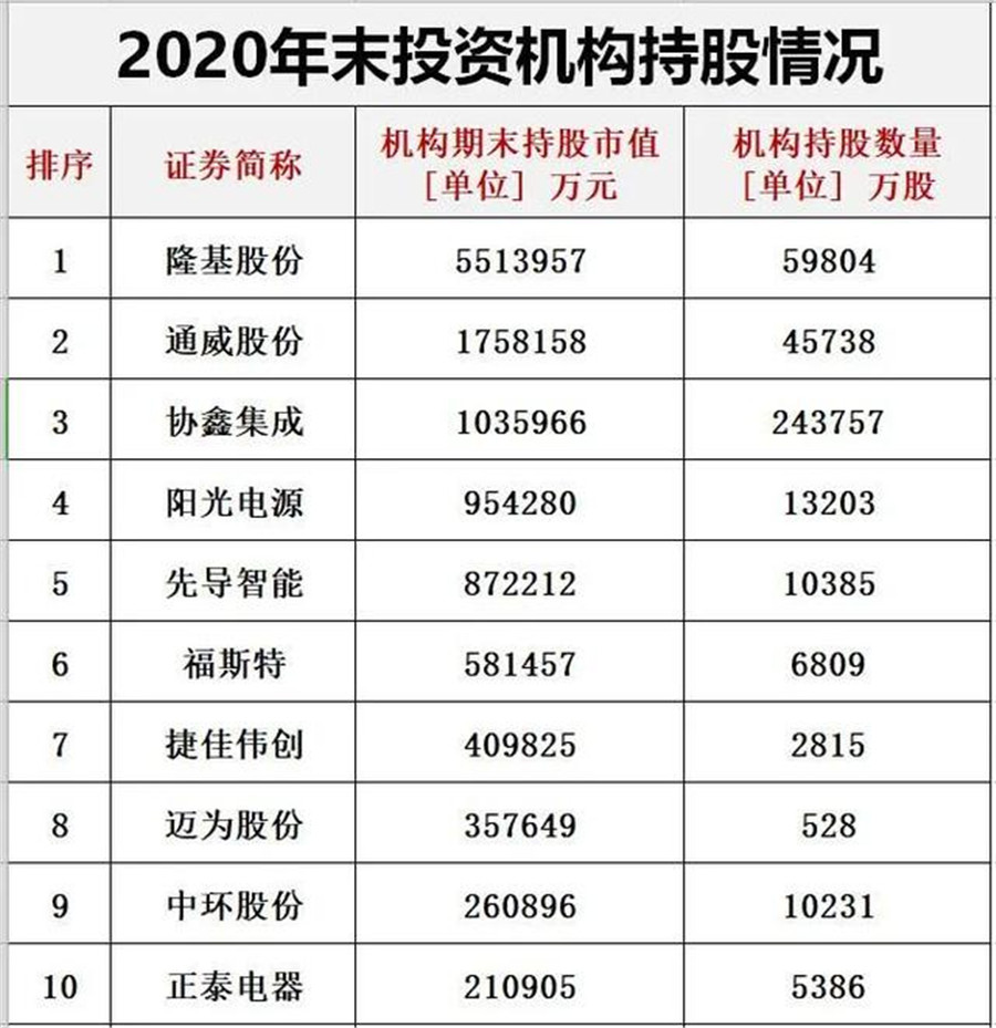 但近期黑鷹光伏團(tuán)隊(duì)做了另一維度相關(guān)統(tǒng)計(jì)分析,結(jié)果與光伏產(chǎn)業(yè)層面一片欣欣向榮的大趨勢(shì)并不完全“呼應(yīng)”。我們發(fā)現(xiàn):2020年第四季度,機(jī)構(gòu)投資者巨額減持光伏概念股,具體而言,第四季度末較第三季度末投資機(jī)構(gòu)持股倉(cāng)位減少了1727350萬(wàn)股!(后附2020年末投資機(jī)構(gòu)持股光伏排行榜)。