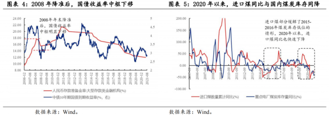 2020年以來(lái),進(jìn)口煤數(shù)量與國(guó)內(nèi)煤炭庫(kù)存同降,煤炭?jī)r(jià)格上漲持續(xù)時(shí)間可能比第二輪更長(zhǎng)。2015-2016年,雖然國(guó)內(nèi)煤炭庫(kù)存同比處于低位,但進(jìn)口煤數(shù)量同比持續(xù)攀升,可能部分彌補(bǔ)了國(guó)內(nèi)煤炭的數(shù)量。而2020年以來(lái),進(jìn)口煤炭數(shù)量與國(guó)內(nèi)煤炭庫(kù)存同步下滑,并且下滑的幅度要高于2015-2016年,疊加碳中和的長(zhǎng)期政策,國(guó)內(nèi)煤炭?jī)r(jià)格上漲的持續(xù)時(shí)間可能比第二輪更長(zhǎng)。