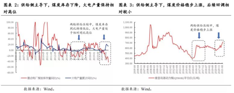 庫(kù)存同比低位+火電產(chǎn)量同比相對(duì)高位是煤炭?jī)r(jià)格和煤炭股啟動(dòng)信號(hào)。2016年的煤炭股行情與今年都是在供給側(cè)壓縮下主導(dǎo),在兩輪行情的起步階段,煤炭庫(kù)存同比均已經(jīng)過(guò)一段時(shí)間的下滑,與此同時(shí),火電產(chǎn)量同比保持在相對(duì)高位,如圖2中火電產(chǎn)量同比始終高于煤炭庫(kù)存同比。在供給側(cè)主導(dǎo)的行情中,煤炭?jī)r(jià)格穩(wěn)步上漲,煤炭股與煤炭?jī)r(jià)格的啟動(dòng)時(shí)間同比,煤炭?jī)r(jià)格保持在相對(duì)高位,煤價(jià)后續(xù)回調(diào)的幅度較小,例如供給側(cè)改革后的2018年11月至2020年5月,煤炭?jī)r(jià)格下跌幅度不足10%。