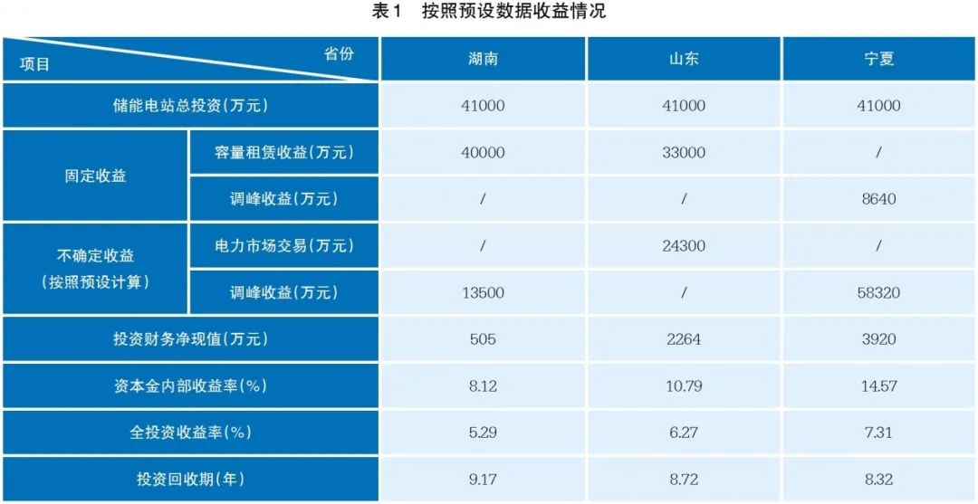 對三省不確定收益預設補償金額和調用次數(shù),湖南輔助服務調峰價格在250元/兆瓦時,調用次數(shù)為年300次;山東電力市場交易放電上限價格0.5元/千瓦時,充電下限價格0.2元/千瓦時,年充放電次數(shù)600次;寧夏輔助服務調峰補償價格0.6元/千瓦時,年調用次數(shù)600次,預估收益情況如表1所示。