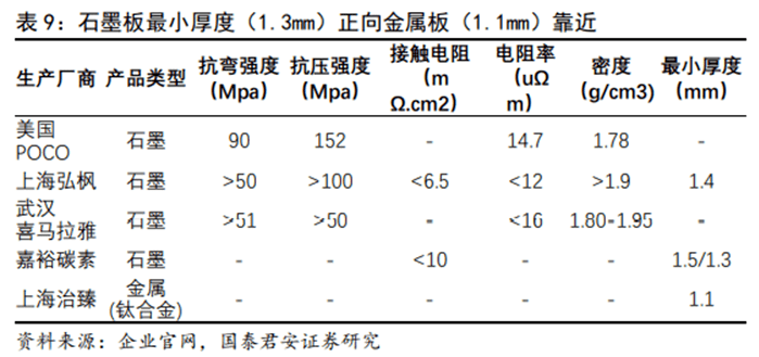 石墨板適應(yīng)需求趨于薄型化,乘用車為金屬板帶來機(jī)遇。石墨板:由于其高耐腐蝕性、高耐久性,以及相對(duì)較低的技術(shù)壁壘,率先實(shí)現(xiàn)國(guó)產(chǎn)化,在對(duì)體積較不敏感而對(duì)耐久性敏感的特種車、商用車領(lǐng)域示范應(yīng)用。然而,石墨雙極板的制作周期長(zhǎng)、機(jī)械性能差、加工難度大、制作成本高等劣勢(shì)也不可忽視。市場(chǎng)已有越來越多的企業(yè)成功開發(fā)出超薄超精細(xì)石墨雙極板,提前突破了國(guó)家制定2025年前單組石墨雙極板厚度1.5mm的要求,功率密度開始接近豐田第一代金屬雙極板的水平。金屬板:抗腐蝕性差,壽命過短是其應(yīng)用的阻礙,然而隨著涂層工藝的持續(xù)進(jìn)步與突破,其有望實(shí)現(xiàn)和石墨板相同的使用壽命。豐田汽車公司率先在旗下Mirai燃料電池汽車上使用金屬雙極板和涂層,解決了腐蝕、成本和導(dǎo)電等一系列問題。憑借其機(jī)械性能優(yōu)異、高體積功率密度、成本低廉且易批量生產(chǎn)等優(yōu)勢(shì),金屬雙極板將在乘用車規(guī)?;瘧?yīng)用的進(jìn)程中實(shí)現(xiàn)突破。