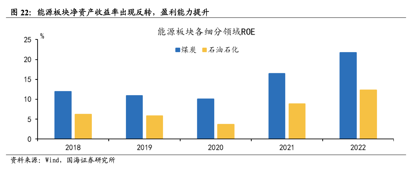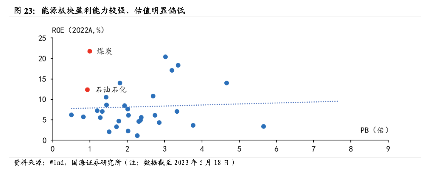 國(guó)海證券6月8日研報(bào)表示,能源板塊中上市公司擁有較為優(yōu)質(zhì)的基本面和偏低的市場(chǎng)估值,處于優(yōu)質(zhì)資產(chǎn)被低估的狀態(tài)。根據(jù)國(guó)海證券6月8日研報(bào)測(cè)算,截止到5月24日,石油石化、煤炭、公用事業(yè)2022年全年的ROE分別為12.32%、21.74%、5.59%,盈利能力較強(qiáng),且PB十年分位分別為 8.3%、35.9%、37.8%,能源是優(yōu)質(zhì)資產(chǎn)被低估的主要領(lǐng)域,調(diào)整過(guò)后仍具備性價(jià)比。