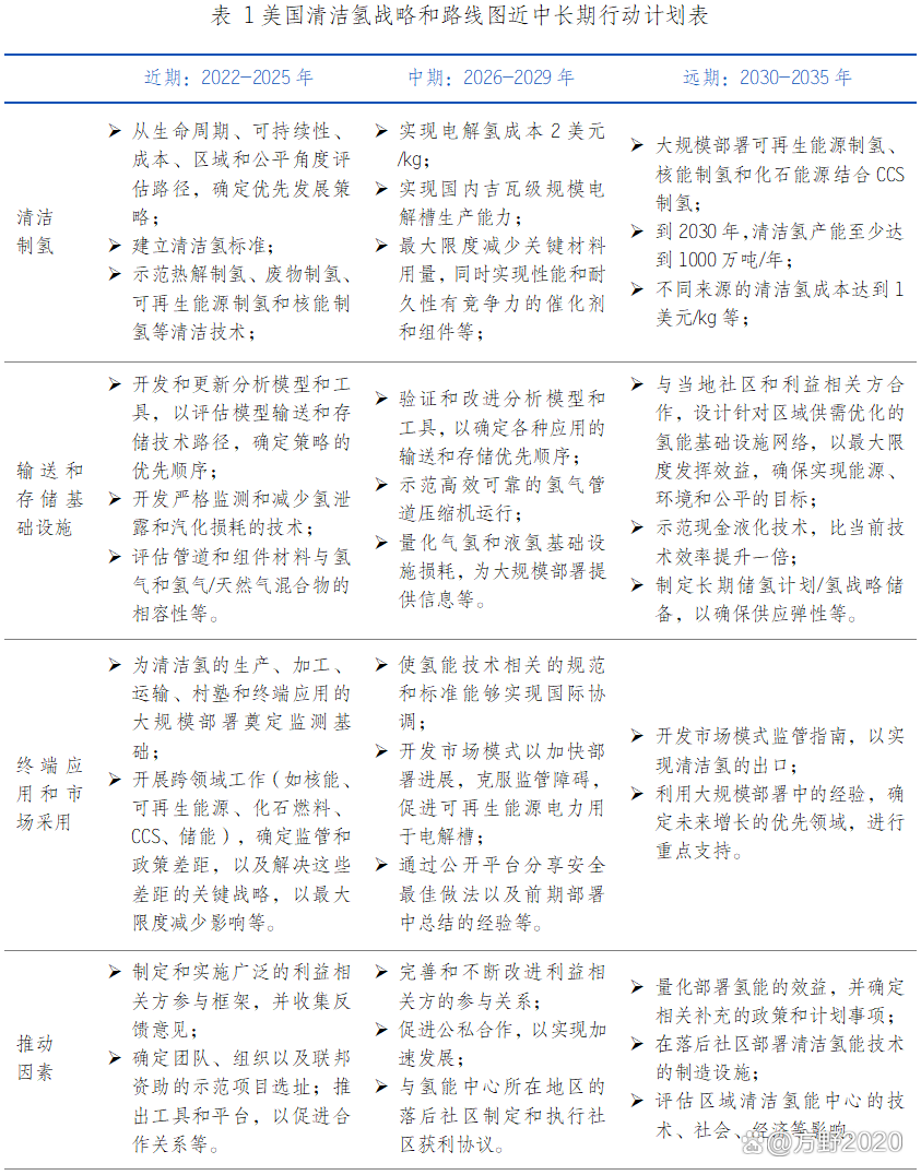 美國(guó)是最早發(fā)展氫能的國(guó)家,多年來(lái)始終將氫能作為重要能源戰(zhàn)略儲(chǔ)備技術(shù),持續(xù)支持氫能全產(chǎn)業(yè)鏈技術(shù)研發(fā),并加快示范創(chuàng)建和戰(zhàn)略部署,以期實(shí)氫能產(chǎn)業(yè)規(guī)模化發(fā)展。2021年7月美國(guó)能源部(以下簡(jiǎn)稱“DOE”)宣布投資5250萬(wàn)美元用于綠氫技術(shù)的研發(fā),這筆資金將惠及多項(xiàng)氫能研發(fā)項(xiàng)目,旨在十年內(nèi)將氫能成本降低80%,達(dá)到每千克1美元。11月DOE又發(fā)布《碳中性氫能技術(shù)基礎(chǔ)科學(xué)》研發(fā)指南,明確了高效新型電解水制氫、氫機(jī)理等4個(gè)優(yōu)先研發(fā)方向。2022年2月,DOE下屬化石能源和碳管理辦公室宣布2800萬(wàn)美元的聯(lián)邦資金,用于推動(dòng)綠氫作為一種無(wú)碳燃料用于交通、工業(yè)和電力生產(chǎn)。2022年11月,DOE發(fā)布《國(guó)家清潔氫能戰(zhàn)略和路線圖(草案)》,制定2022-2035年近、中、長(zhǎng)期清潔氫能發(fā)展行動(dòng)時(shí)間表,如表1所示,明確在制氫、儲(chǔ)氫、運(yùn)氫及終端應(yīng)用的各階段發(fā)展目標(biāo)。此外,美國(guó)于2023年6月發(fā)布首個(gè)國(guó)家能源戰(zhàn)略規(guī)劃路線圖。