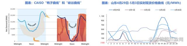 國內(nèi)以山東為代表的部分省份同樣有明顯的填谷需求。山東裝機(jī)結(jié)構(gòu)與CAISO相似,截至22年底,光伏裝機(jī)占比達(dá)到22.5%。在2023年五一假期期間,山東省內(nèi)用電負(fù)荷下降約15%,引發(fā)連續(xù)負(fù)電價(jià)現(xiàn)象。值得注意的是,4月29日-5月1日現(xiàn)貨價(jià)格曲線形狀類似鴨子曲線,期間10時(shí)-15時(shí)負(fù)電價(jià)出現(xiàn)尤為頻繁,而該時(shí)段為光伏發(fā)電高峰。