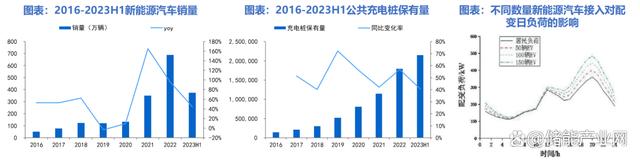 充電樁保有量隨新能源汽車快速提升,改變配電網(wǎng)形態(tài)。截至2023H1,我國公共充電樁保有量為214.86萬臺,同比+40.63%。2023H1,新能源汽車銷量同比+44.13%,保持快速增長,可以預(yù)見未來隨新能源汽車銷量繼續(xù)快速提升,充電樁保有量將持續(xù)增加。充電樁的大量增加將對配電網(wǎng)產(chǎn)生沖擊,相比于常規(guī)交流充電樁,快充直流樁由于功率更大、充電時(shí)間更短,產(chǎn)生沖擊更大。