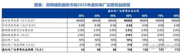 輔助服務(wù)和電力現(xiàn)貨兩種獲利途徑存在部分重合關(guān)系,電力現(xiàn)貨基本對最大的輔助服務(wù)品種——調(diào)峰服務(wù)形成替代。無論通過哪種途徑獲得收益,我們測算當(dāng)運(yùn)營商分成比例為50%時(shí),2025年虛擬電廠運(yùn)營市場規(guī)模均在百億元級別。