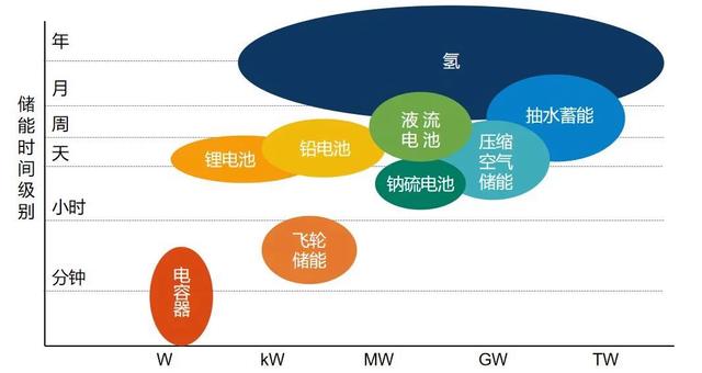各類(lèi)儲(chǔ)能在放電時(shí)間和容量性能的對(duì)比圖