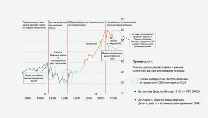 20世紀(jì)美國(guó)的兩次崛起可視為其積累周期、“漫長(zhǎng)世紀(jì)”的基礎(chǔ)。這兩次崛起基于兩次世界大戰(zhàn)及其戰(zhàn)后恢復(fù)期,這里值得注意的是,兩次大戰(zhàn)均發(fā)生于歐洲和亞洲,不在美國(guó)的領(lǐng)土之上。很大程度上,美國(guó)為這兩次在其領(lǐng)土之外進(jìn)行的戰(zhàn)爭(zhēng)和戰(zhàn)后重建提供了物資和技術(shù)(在擴(kuò)展自己產(chǎn)量的基礎(chǔ)上)。另一方面,在美聯(lián)儲(chǔ)的運(yùn)作下世界經(jīng)濟(jì)美元化的程度不斷加深??梢哉f,美國(guó)“漫長(zhǎng)世紀(jì)”基于其疆域以外的世界經(jīng)歷“破壞—重建”,循環(huán)往復(fù)。