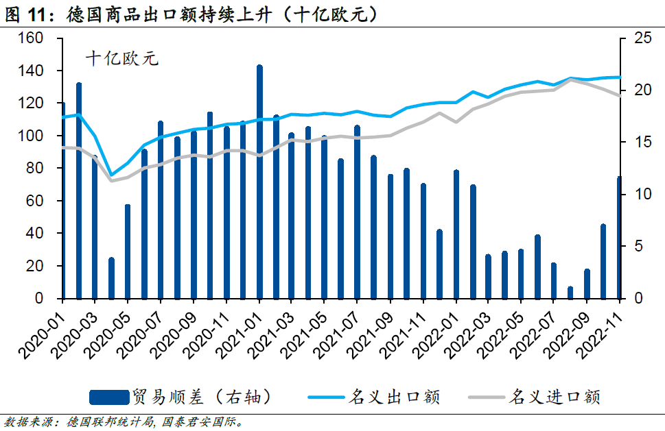 更加重要的是,為了應(yīng)對(duì)中長(zhǎng)期能源危機(jī),歐盟各國(guó)也開(kāi)始加大對(duì)制造業(yè)的支持力度,制定了“能源系統(tǒng)數(shù)字化”計(jì)劃,該計(jì)劃預(yù)期在2030年前在基礎(chǔ)設(shè)施方面投資5,650億歐元,以大力發(fā)展光伏和新能源汽車(chē)產(chǎn)業(yè);除此以外,歐盟還加大了對(duì)液化天然氣產(chǎn)業(yè)的投資力度。德國(guó)作為歐洲經(jīng)濟(jì)的最重要組成部門(mén),受益于政策支持,其工業(yè)生產(chǎn)并沒(méi)有受到太多能源問(wèn)題的干擾,尤其是核心的資本貨物出口額在衰退預(yù)期的背景下持續(xù)增長(zhǎng)。