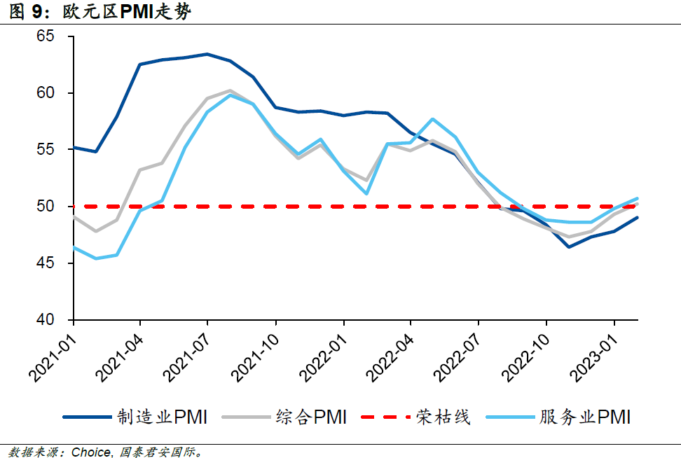 這一系列的政策效果在2022年末開(kāi)始逐步顯露,歐洲的經(jīng)濟(jì)指標(biāo)開(kāi)始出現(xiàn)回暖跡象。歐元區(qū)綜合PMI初值及服務(wù)業(yè)PMI初值在2023年1月扭轉(zhuǎn)了約半年的收縮趨勢(shì),回到了榮枯線上方;雖然制造業(yè)PMI仍處于收縮區(qū)間,但是收縮幅度也大幅改善。