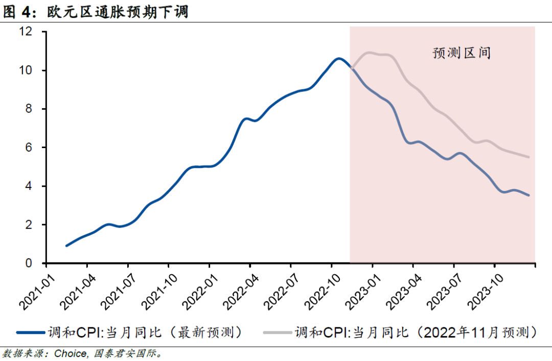 暖冬的到來(lái)極大程度上縮減了供熱對(duì)天然氣的需求,歐洲基準(zhǔn)TTF荷蘭天然氣期貨價(jià)格延續(xù)了之前的大幅回落趨勢(shì)。截至2023年1月中旬,期貨價(jià)格已經(jīng)低于俄烏沖突爆發(fā)前的水平。在天然氣價(jià)格走低的情況下,能源價(jià)格不應(yīng)該繼續(xù)推動(dòng)通脹高企;另一方面,隨著中國(guó)2023年經(jīng)濟(jì)預(yù)期的大幅上修,歐元區(qū)出口有望迎來(lái)顯著改善。歐洲2023年的衰退預(yù)期似乎也應(yīng)該畫(huà)上一個(gè)問(wèn)號(hào)?