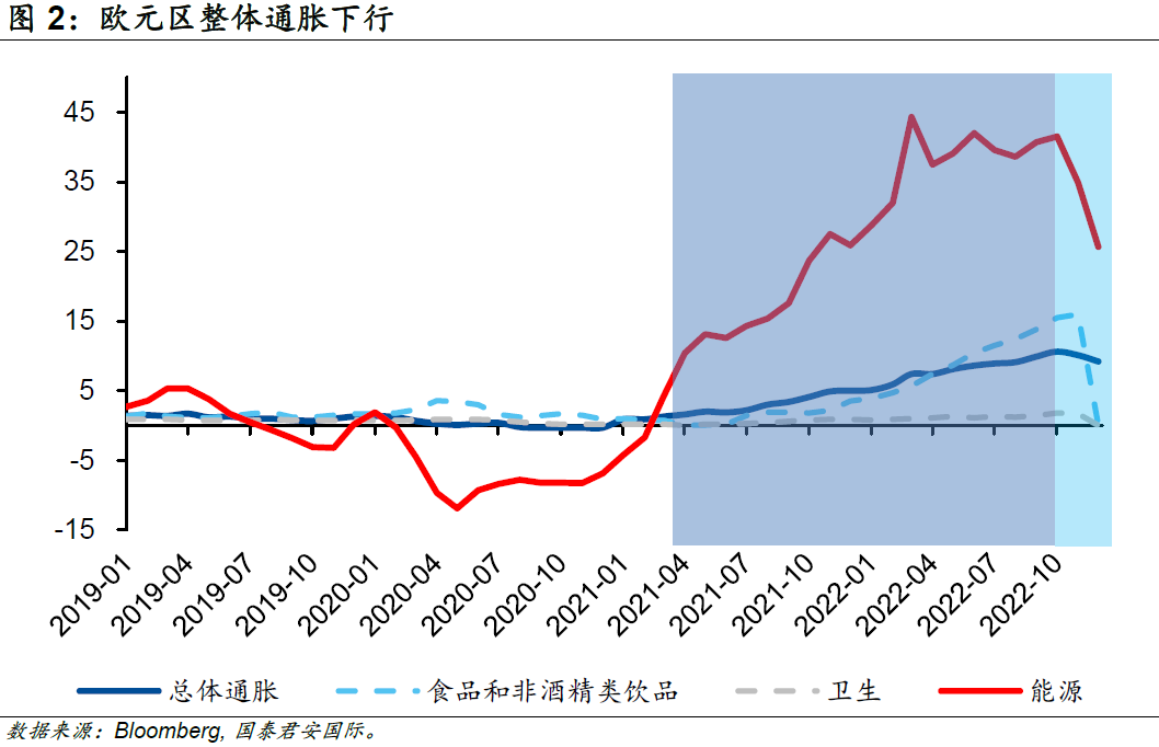 隨著天然氣價(jià)格的迅速回落,歐元區(qū)整體通脹也隨之下行。歐元區(qū)2022年12月的能源通脹已經(jīng)由同年10月最高的41.5%大幅連續(xù)回落至25.7%,受此推動(dòng),整體通脹率亦由10月最高的10.6%連續(xù)回落至9.2%。