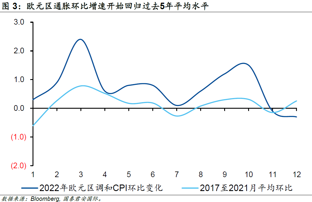 另一方面,歐元區(qū)通脹環(huán)比增速顯著高于季節(jié)性的趨勢(shì)已經(jīng)開(kāi)始扭轉(zhuǎn),這意味著通脹的增長(zhǎng)動(dòng)能開(kāi)始減弱,2022年11月及12月已經(jīng)連續(xù)兩個(gè)月低于歷史平均水平。