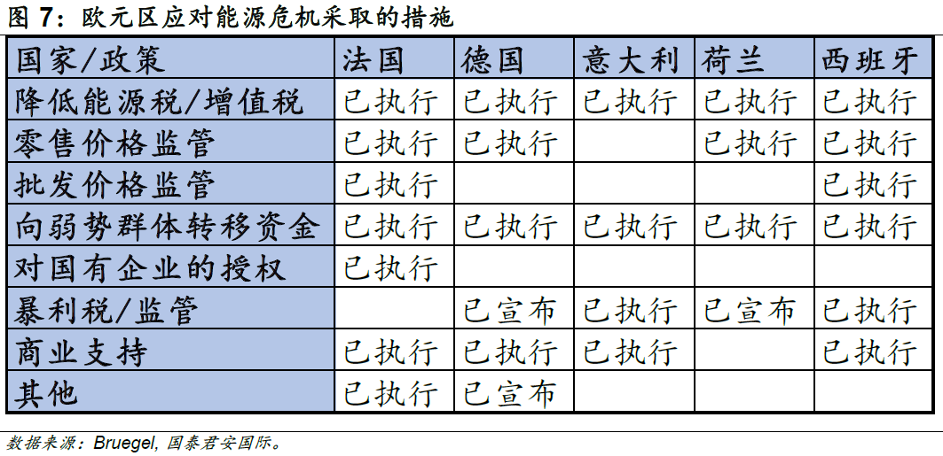 從總量政策來(lái)看,財(cái)政端的支持在很大程度上減輕了能源危機(jī)的沖擊。為應(yīng)對(duì)俄烏沖突帶來(lái)的能源問(wèn)題,歐洲各國(guó)不約而同地采取了多種財(cái)政措施。根據(jù)Bruegel的統(tǒng)計(jì),歐洲各國(guó)已經(jīng)撥款7,055億歐元用于緩解能源危機(jī)帶來(lái)的影響。歐盟撥款總計(jì)6,004億歐元,其中德國(guó)支出2,640億歐元,占2021年GDP的7.4%;英國(guó)撥款970億歐元,占2021年GDP的3.5%。