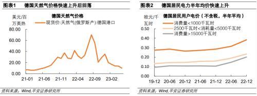 德國電力消耗密集型行業(yè)主要是紙制品、化工、基本金屬和非金屬制品等,也是工業(yè)品價格通脹較嚴(yán)重的行業(yè)。將行業(yè)電力消耗規(guī)模比上行業(yè)總產(chǎn)出,可以得到該行業(yè)的電力消耗密集度。德國紙制品行業(yè)的電力密集程度較高,每1歐元的產(chǎn)出需要投入0.51KWh的電力,化工、基本金屬和非金屬制品行業(yè)的電力密集度分別為0.4、0.36和0.33KWh/歐元。使用歐元區(qū)主要制造業(yè)PPI同比增速來衡量德國制造業(yè)的通脹形勢,可以看到2022年P(guān)PI同比最高的是焦炭和石油行業(yè),漲幅高達(dá)56.7%;電力消耗密集度較高的紙制品、化工、基本金屬和非金屬制品行業(yè)通脹程度也較高,其PPI同比分別為26.6%、29.9%、26.6%和16.7%。