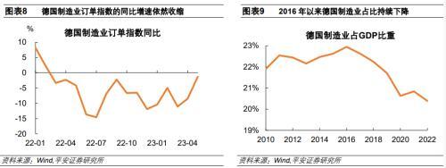 2)制造業(yè)方面,2022年7月和12月,德國制造業(yè)訂單同比下降14.6%和11.9%。2022年德國制造業(yè)占GDP比重為20.4%,較2021年下降了0.4%,仍然延續(xù)了2016年以來制造業(yè)占比逐漸降低的趨勢,呈現(xiàn)了一定程度的“去工業(yè)化”傾向。