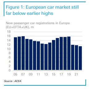 在需求方面,歐洲消費(fèi)者的購買情緒最初受到疫情的抑制。自2022年以來,能源價(jià)格上漲、通脹問題以及利率上升對歐洲汽車消費(fèi)也產(chǎn)生了負(fù)面影響。此外,全球供應(yīng)鏈出現(xiàn)了中斷,這抑制了全球乘用車生產(chǎn)。