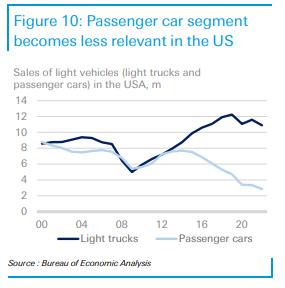 2022年,輕型車銷量(包括輕型卡車和乘用車)在美國下降了8%,約為1380萬輛。利率上升、供應(yīng)鏈持續(xù)中斷和燃料價(jià)格上漲是造成這一現(xiàn)象的主要因素。前幾年,輕型車的銷量已經(jīng)呈下降趨勢。新冠肺炎疫情導(dǎo)致2020年美國市場大幅下滑,至今仍未復(fù)蘇。