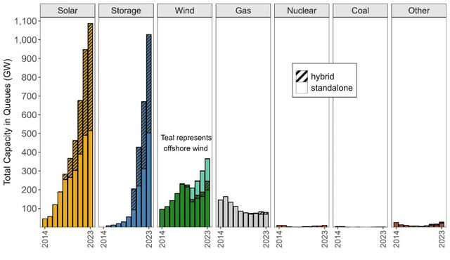 根據(jù)該報告,美國各地新能源發(fā)電和儲能項目的積壓問題進(jìn)一步加劇。截至2023年底,有近2600GW的發(fā)電和儲能容量正在尋求接入電網(wǎng),是現(xiàn)有美國電廠裝機總量的兩倍有余,其中超過95%容量來自于清潔能源項目。