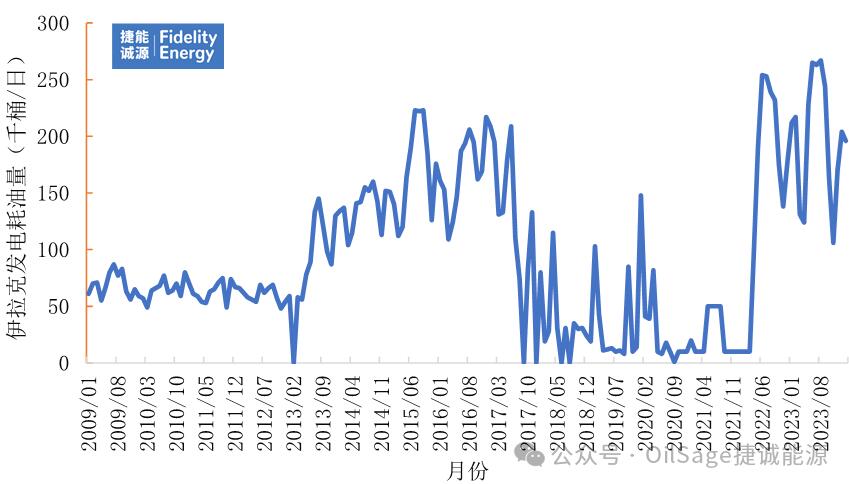 由于天然氣發(fā)電量不足,伊拉克發(fā)電耗油量從2021年的2.4萬桶/日上升到2022年的14.9萬桶/日。2022年伊拉克報(bào)告的發(fā)電燃油總量大幅上升至約36萬桶/日,并在2023年6月創(chuàng)下53.5萬桶/日的歷史新高。