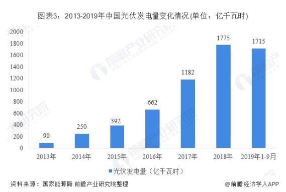 據(jù)國家能源局統(tǒng)計(jì)數(shù)據(jù)顯示,2013年以來,我國光伏發(fā)電量增長迅速。2013年,全國光伏發(fā)電量僅為90億千瓦時(shí),到2018年,全國光伏發(fā)電量1775億千瓦時(shí),同比增長50%;平均利用小時(shí)數(shù)1115小時(shí),同比增加37小時(shí)。光伏發(fā)電平均利用小時(shí)數(shù)較高的地區(qū)中,蒙西1617小時(shí)、蒙東1523小時(shí)、青海1460小時(shí)、四川1439小時(shí)。截至2019年9月底,全國光伏發(fā)電量為1715億千瓦時(shí)。