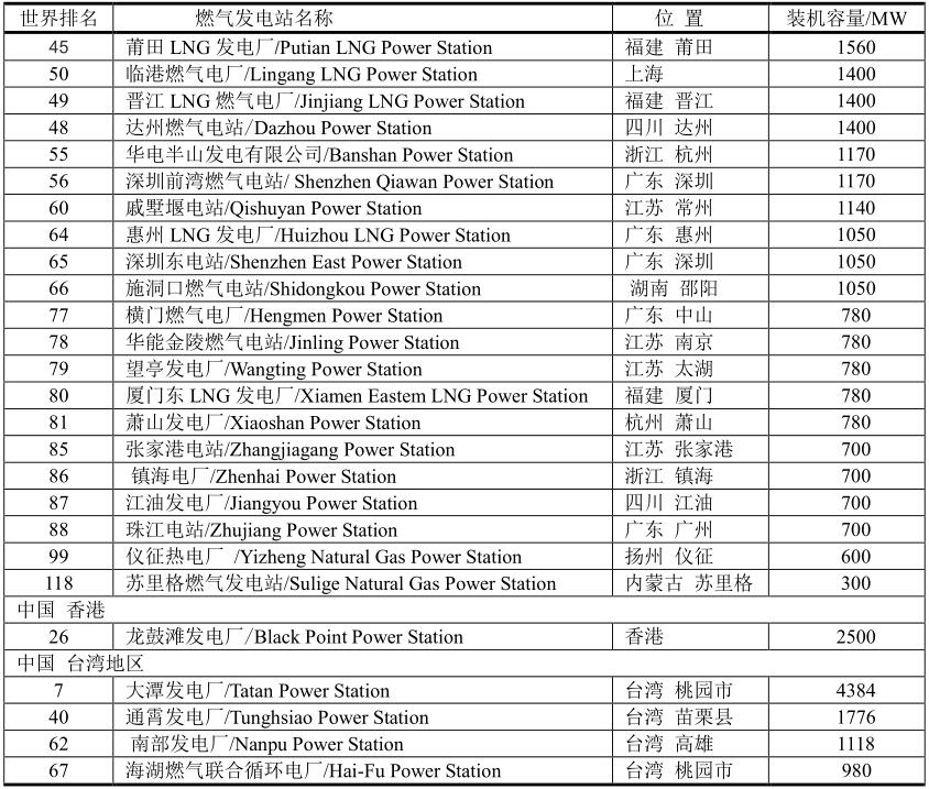 中國最大的燃?xì)獍l(fā)電站在中國臺灣地區(qū)—大潭發(fā)電廠(Tatan Power Station),其次是香港—龍鼓灘發(fā)電廠(Black Point Power Station)。