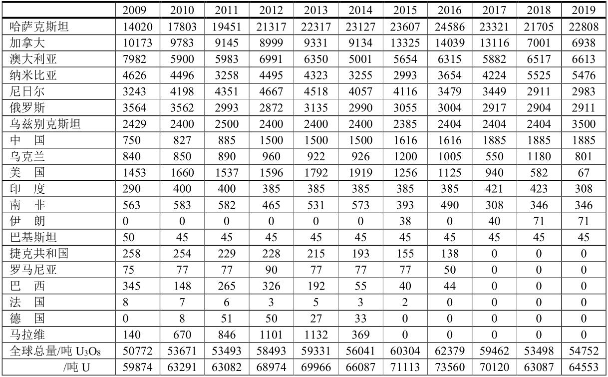 2009-2019年期間各國鈾礦生產(chǎn)