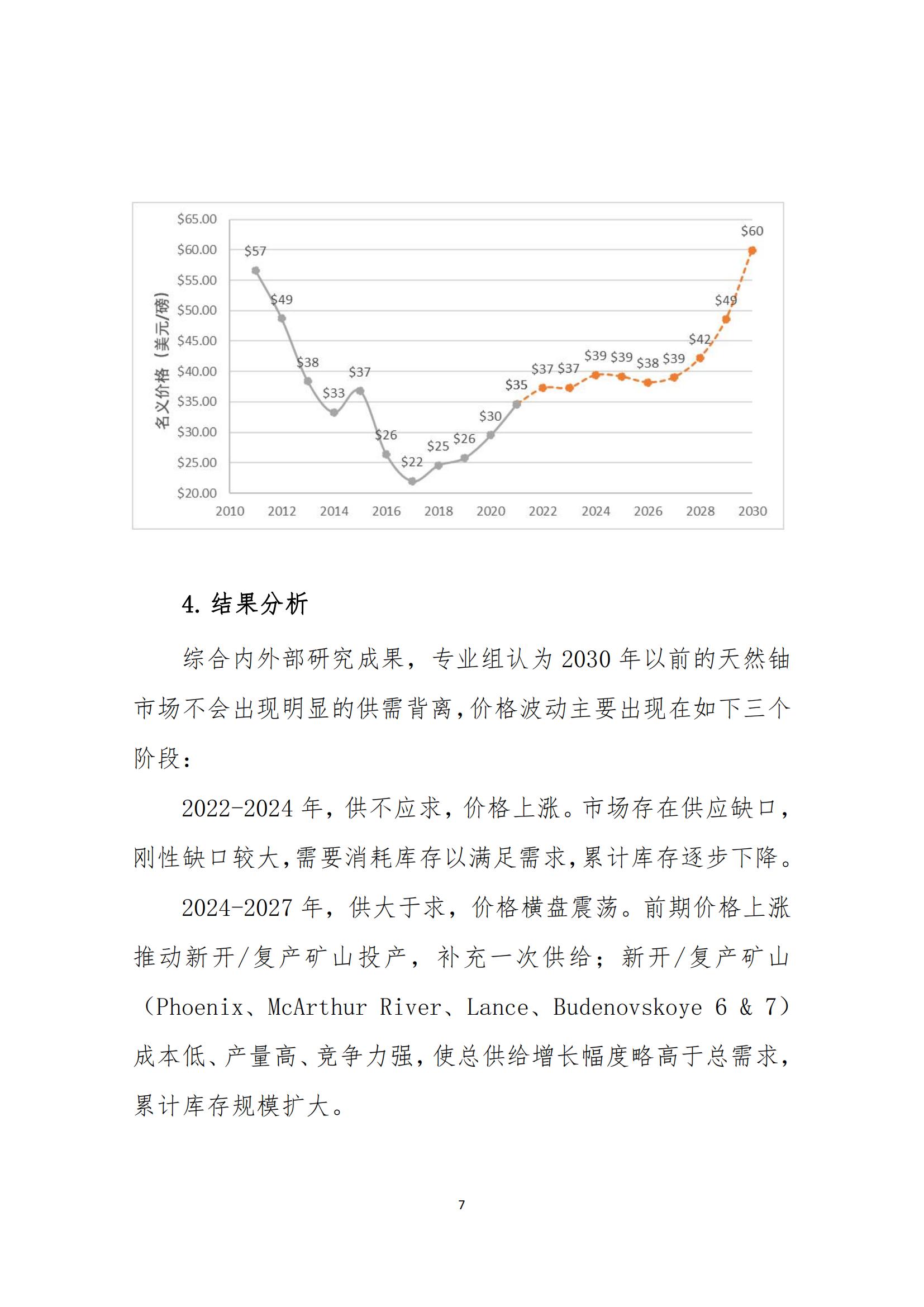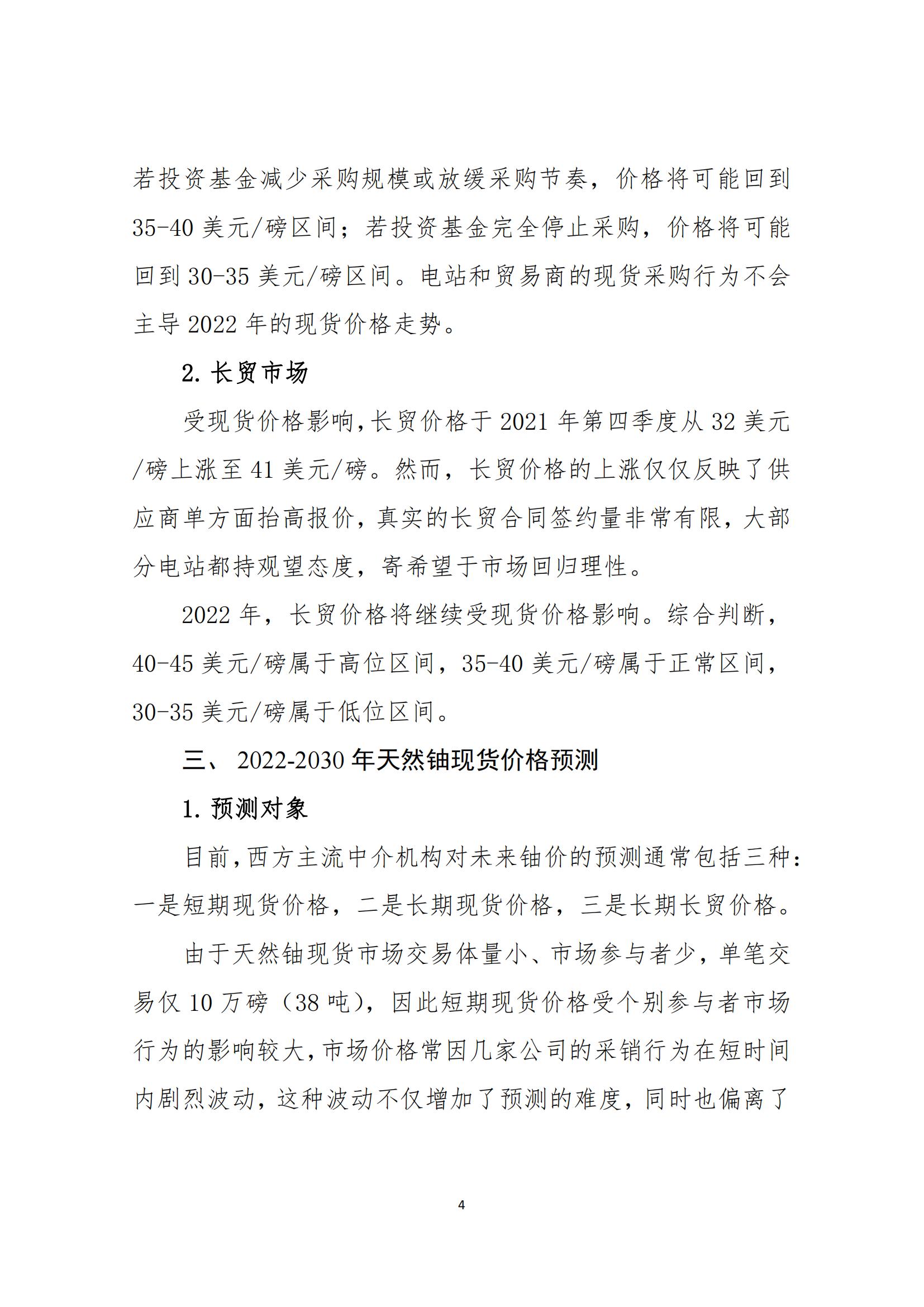 報告還對2022-2030年天然鈾現(xiàn)貨價格作了預測。之所以選擇對長期現(xiàn)貨價格進行預測,是因為該價格是反應市場供需關(guān)系的主要指標,是長貿(mào)協(xié)議引用的重要指數(shù),且不易受到短期市場投機行為的影響。
