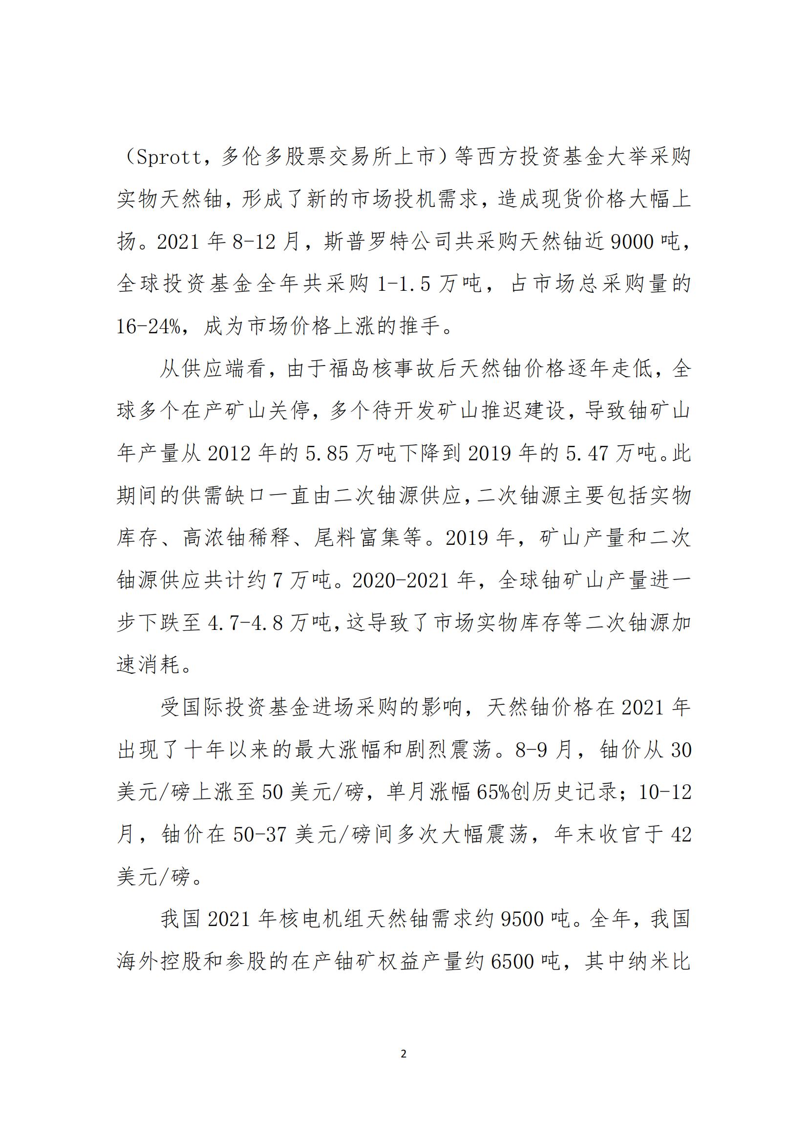 報告認為,2021年的全球天然鈾市場,仍供大于求,但正逐步趨于平衡。值得注意的是,2018年以來,黃餅公司(Yellow Cake,倫敦股票交易所上市)和斯普羅特公司(Sprott,多倫多股票交易所上市)等西方投資基金大舉采購實物天然鈾,形成了新的市場投機需求,造成現(xiàn)貨價格大幅上揚。8-9月,鈾價從30美元/磅上漲至50美元/磅,單月漲幅65%創(chuàng)歷史記錄;10-12月,鈾價在50-37美元/磅間多次大幅震蕩,年末收官于42美元/磅。我國海外鈾礦權(quán)益產(chǎn)品為核電天然鈾供應提供了有力保障,并在國際大宗商品價格大幅上漲的背景下,有效抑制了天然鈾價格上漲,很好地發(fā)揮了保供穩(wěn)價作用。