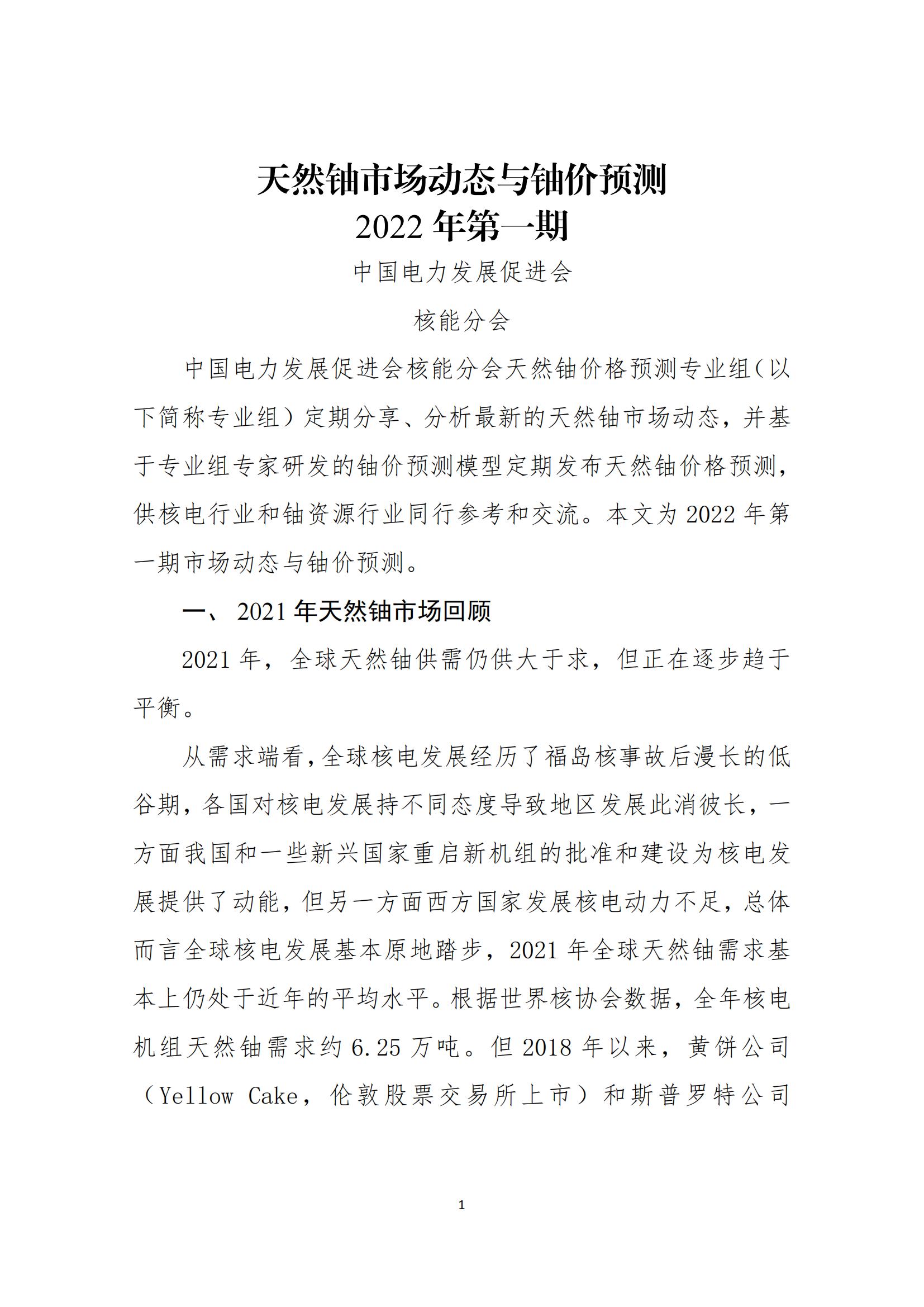 2022年2月7日,虎年春節(jié)后第一個工作日,由中國電力發(fā)展促進會核能分會編制的2022年第一期天然鈾價格預測報告發(fā)布,電力網(wǎng)獲悉,今后報告將每季度發(fā)布一次,一年四期。