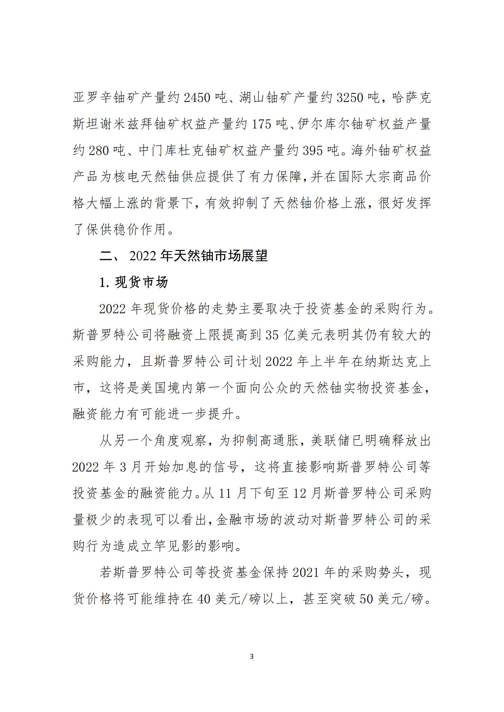 對2022年天然鈾市場的情況,報告作了如下展望?,F(xiàn)貨市場方面,2022年現(xiàn)貨價格的走勢主要取決于投資基金的采購行為。美聯(lián)儲已明確釋放出2022年3月開始加息的信號,若斯普羅特公司等投資基金保持2021年的采購勢頭,現(xiàn)貨價格將可能維持在40美元/磅以上,甚至突破50美元/磅;若投資基金減少采購規(guī)?;蚍啪彶少徆?jié)奏,價格將可能回到35-40美元/磅區(qū)間;若投資基金完全停止采購,價格將可能回到30-35美元/磅區(qū)間。長貿(mào)市場方面,長貿(mào)價格將繼續(xù)受現(xiàn)貨價格影響,綜合判斷,40-45美元/磅屬于高位區(qū)間,35-40美元/磅屬于正常區(qū)間,30-35美元/磅屬于低位區(qū)間。