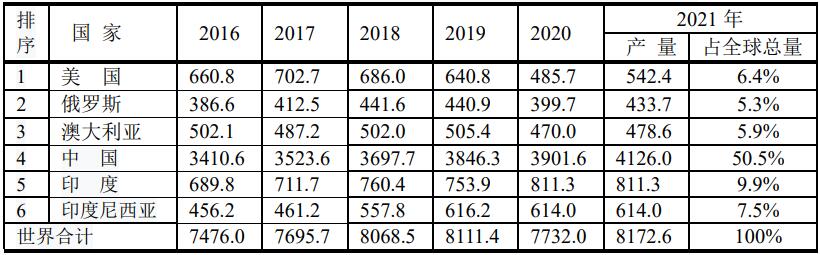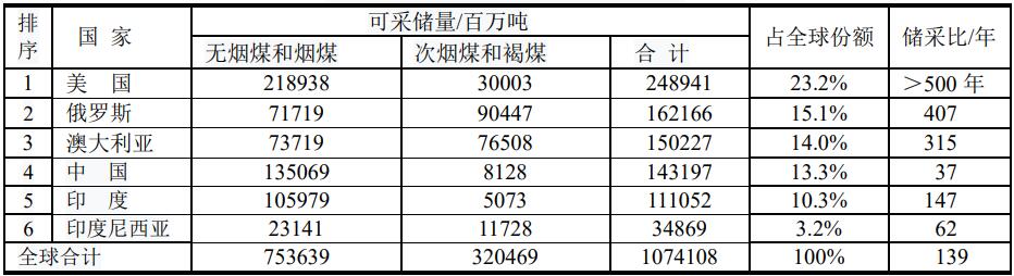 2020年全球原煤可采儲(chǔ)量前6位國(guó)家