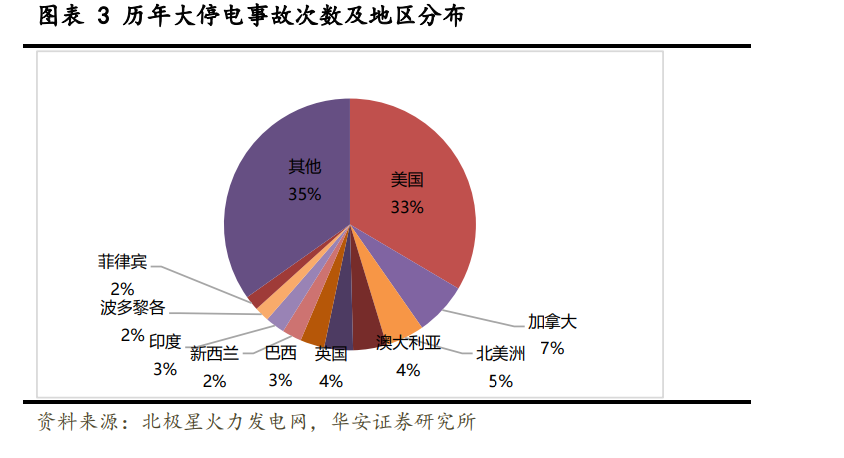 新能源發(fā)電設(shè)備在過程中,外部環(huán)境不能確保設(shè)備可以持續(xù)穩(wěn)定發(fā)電,存在一定的 隨機(jī)性。儲(chǔ)能系統(tǒng)可以對(duì)隨機(jī)性、間歇性和波動(dòng)性的可再生能源發(fā)電出力進(jìn)行平滑控制, 從源頭降低波動(dòng)性,滿足可再生能源并網(wǎng)要求,為未來大規(guī)模發(fā)展應(yīng)用打好基礎(chǔ)。全球 范圍內(nèi)具有突發(fā)性、影響范圍超過 10 萬人、停電時(shí)長(zhǎng)>1h 的大停電事故屢屢發(fā)生,美 國(guó)、加拿大、澳大利亞、巴西、印度等國(guó)家大停電事故發(fā)生次數(shù)最多,普遍具有國(guó)土面 積遼闊、供電跨度大、電力運(yùn)行工況復(fù)雜的特點(diǎn)。北美電網(wǎng)系統(tǒng)設(shè)施老舊,亞非拉地區(qū) 缺乏強(qiáng)大電力設(shè)施建設(shè)投入,導(dǎo)致斷電、缺電現(xiàn)象頻發(fā),疊加氣候變暖、寒潮、龍卷風(fēng)、 高溫干旱等極端氣候多發(fā),當(dāng)?shù)鼐用駥?duì)緊急備電需求屬于剛需。戶用家儲(chǔ)在電廠事故或 者極端自然災(zāi)害事件中提供應(yīng)急電源,提高用電穩(wěn)定性。全球分布式光伏和戶用家儲(chǔ)仍 處于低水平起步階段,大部分地區(qū)光儲(chǔ)滲透率在 10%以下,發(fā)展空間大。
